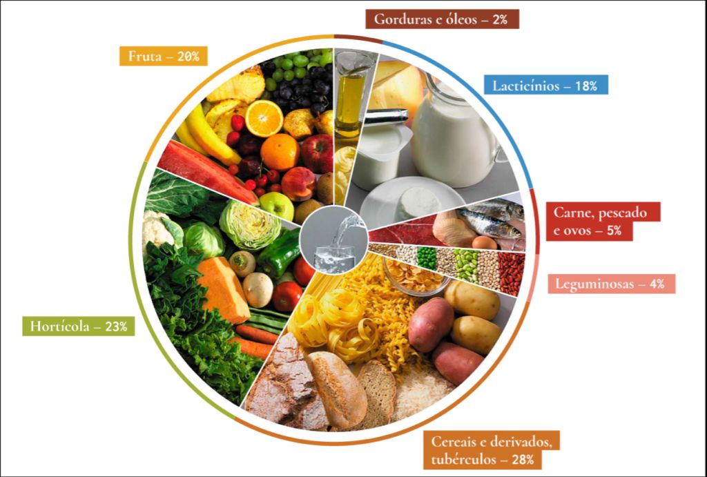 A nova Roda dos Alimentos é composta por 7 grupos de diferentes dimensões. Estes indicam qual a proporção (de peso) de alimentos que deve estar presente na alimentação diária: